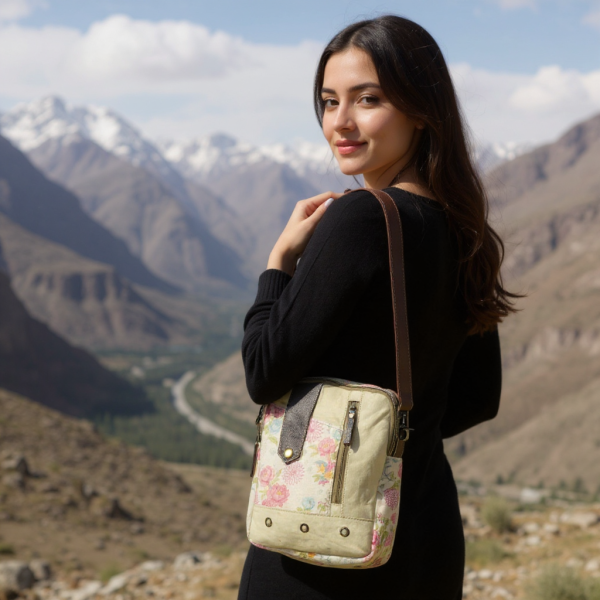 This uniquely crafted weekender is a captivating fusion of floral printed rug in soothing colors, luxurious leather, and upcycled canvas. The zipped main compartment ensures secure storage, while the convenient back pocket and leather handles add practicality and elegance.